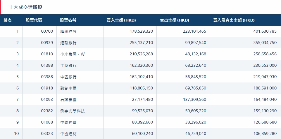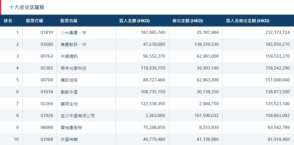 此外,碧桂园服务(06098)、中国神华(01088)、中兴通讯(00763)分别获净买入6703万、4973万、3357万港元。而金沙中国有限公司(01928)遭净卖出1.05亿港元。