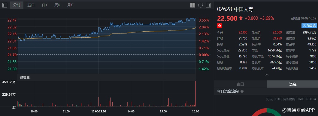 截至今日收盘,中国人寿保险股份(02628)涨3.69%,报22.5港元。