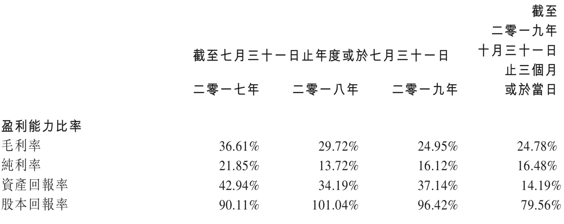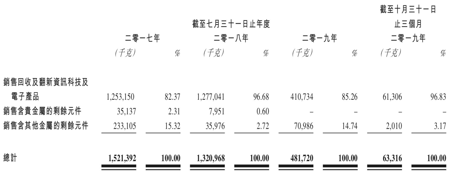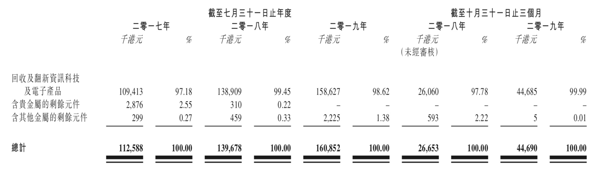 截至2019年7月31日止三个年度及截至2019年10月31日止三个月,富元分别产生收益约1.12亿港元、1.39亿港元、1.6亿港元及4469万港元。其最大客户占期间总收益的19.76%、19.97%、21.38%及31.39%。近三年来,回收及翻新资讯科技及电子产品业务占其总收入的97.18%、99.45%及98、62%,其他部分占比极小。