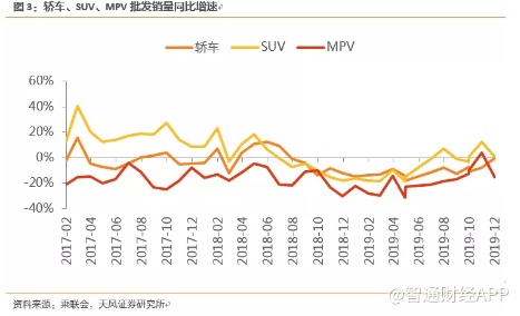 SUV销量维持正增长,轿车销量增速跌幅收窄。根据乘联会数据,12月轿车、SUV、MPV批发销量分别为101.5万辆、100.0万辆和14.8万辆,轿车批发销量同比下降0.5%,SUV批发同比增长0.9%,MPV同比下降15.2%。SUV销量保持正增长,轿车销量降幅持续收窄,MPV销量降幅有所扩大。