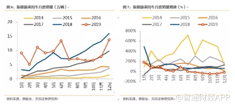 12月新能源乘用车批发销量同比-14%,环比+73%。12月新能源乘用车批发销量13.7万辆,同比下降14%,环比增长73%;1-12月累计销量106.2万辆,同比增长4.4%。目前新能源市场仍持续处于退坡后的调整期。展望2020年,预计随着全球车企在新能源领域的持续发力,特斯拉等巨头入华形成的鲶鱼效应有望推动国内新能源车销量恢复较快增长。