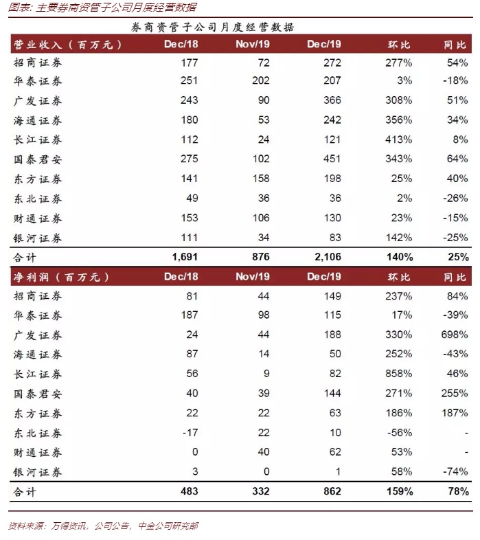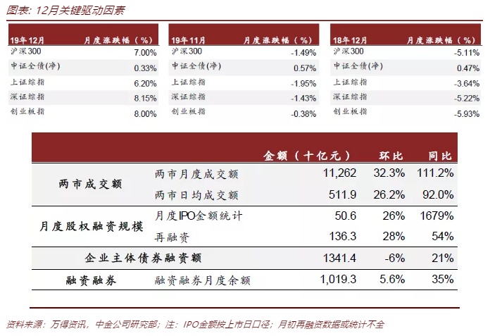12月沪深300指数+7.0%/创业板指+8.0%/中证全债+0.3%,同比于12M18;沪深300指数-5.1%/创业板指-5.9%/中证全债+0.5%、环比于11M19;沪深300指数-1.5%/创业板指-0.4%/中证全债+0.6%,主要股指表现显著改善。此外,我们提示月报口径不含科创板跟投以及直投业务的投资收益,实际投资收入波动可能更大。