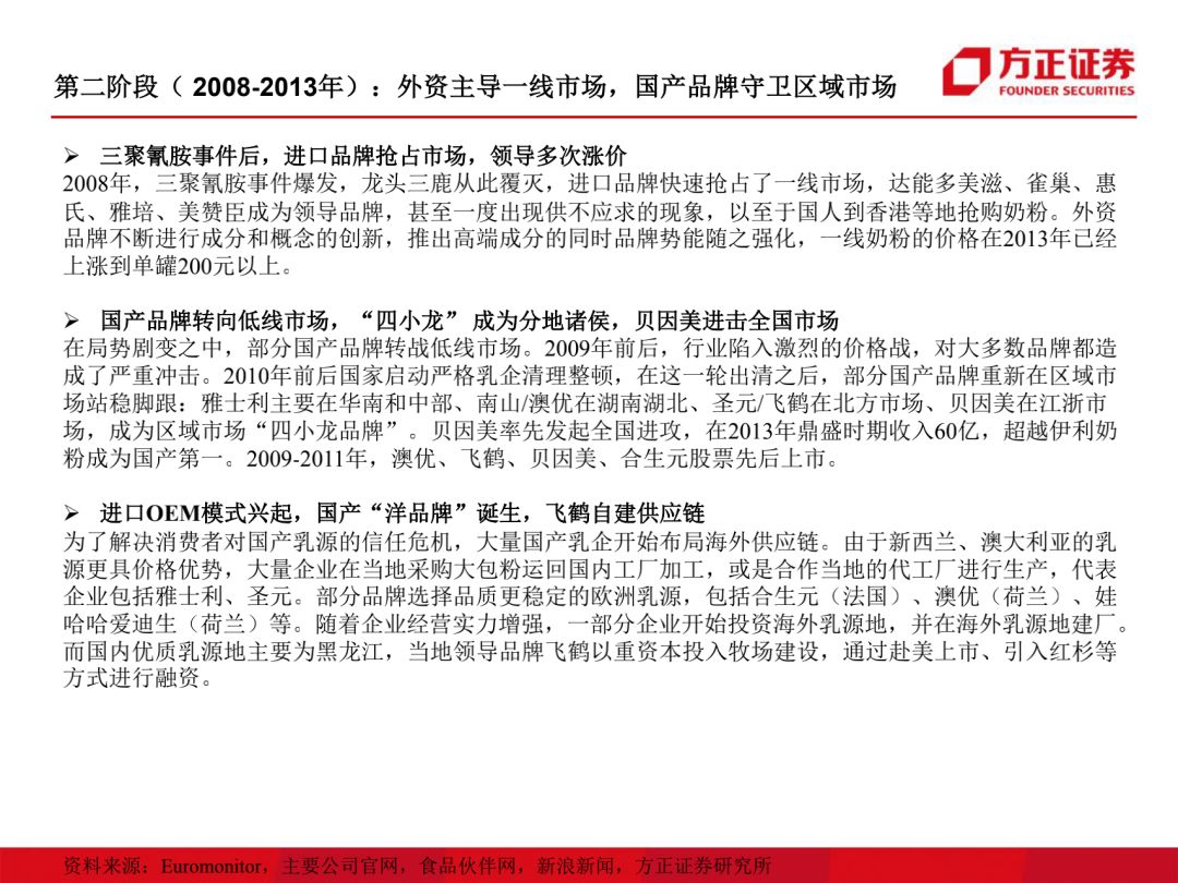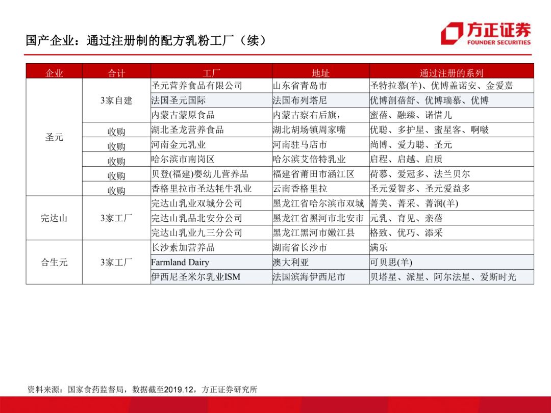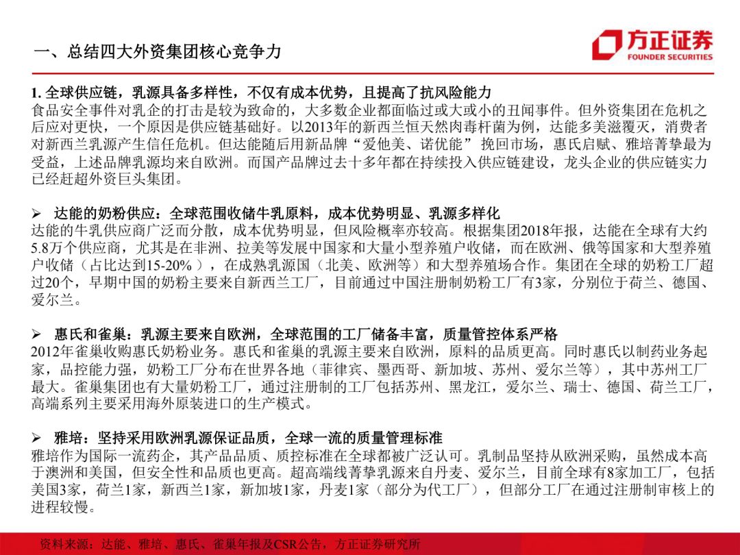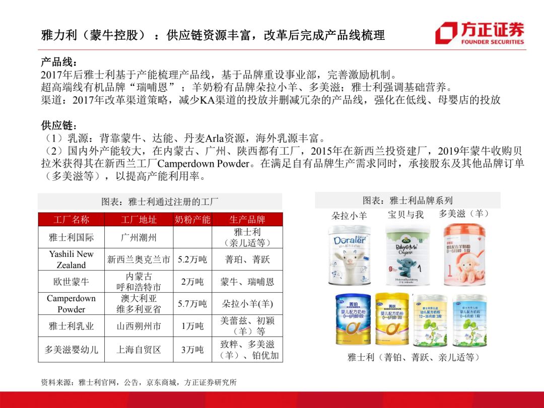 (1)第一是供应链基础。外资集团在全球拥有丰富的乳源和加工厂,达能即使遇到2013年肉毒杆菌事件,多美滋品牌覆灭,随后也快速通过“爱他美” 挽回局面。建设牧场、工厂需要大量资金和时间。在过去十多年里,龙头企业在不懈投入供应链建设,同时《注册制》、《国产乳粉提升方案》等多项政策出台,龙头国产乳企有较多工厂通过注册审核,同时在政策和资本助力下,加快收购整合海外的优质乳源。以飞鹤、蒙牛、澳优为代表的企业已经具备了国际一流的供应链实力。