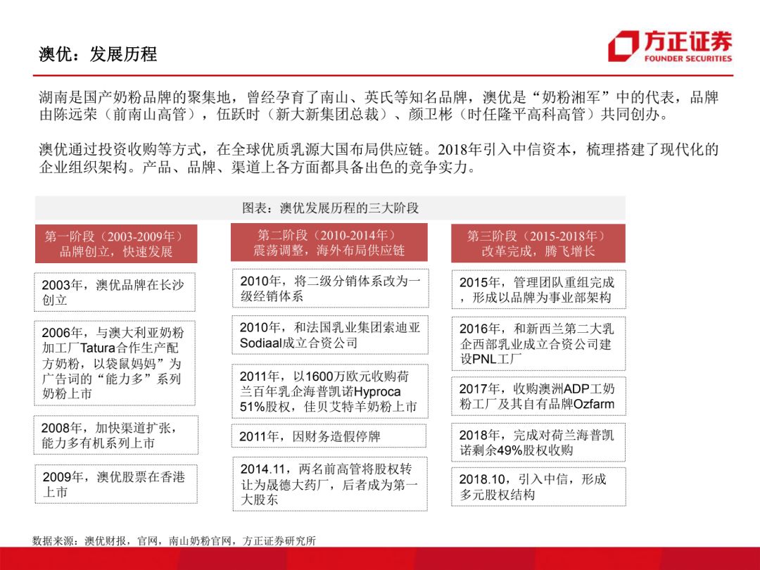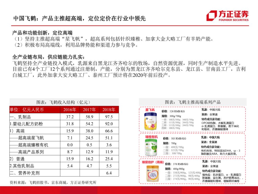(2)奶粉品牌方面,国产品牌崛起的趋势确立,龙头企业市占率快速反扑。虽然过往品牌排位频繁变动,龙头难以持续,但经过十多年的砥砺沉淀,龙头企业的供应链基础,企业治理能力已经赶超外资,同时国家出台多项政策,扶持国产企业收购整合海外乳源。品牌格局的快速变化带来投资机会,建议关注中国飞鹤(06186)、澳优(01717)。