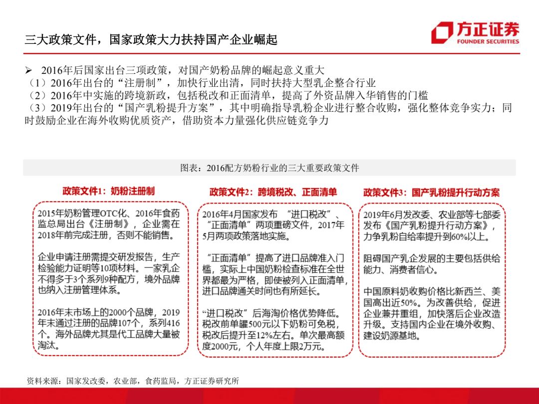 (2)奶粉品牌方面,国产品牌崛起的趋势确立,龙头企业市占率快速反扑。虽然过往品牌排位频繁变动,龙头难以持续,但经过十多年的砥砺沉淀,龙头企业的供应链基础,企业治理能力已经赶超外资,同时国家出台多项政策,扶持国产企业收购整合海外乳源。品牌格局的快速变化带来投资机会,建议关注中国飞鹤(06186.)、澳优(01717)。