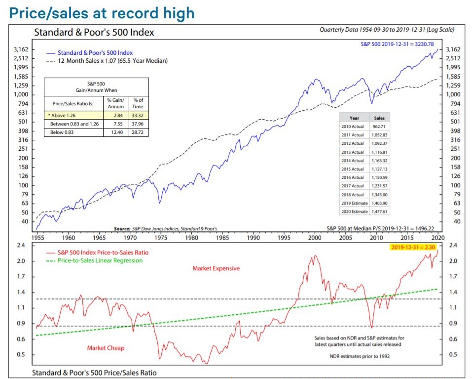 上述图表显示,标普500指数成份股的价格与销售之比创历史新高,“远远超过2000年或2007年的峰值水平,”戴维斯周三在给客户的报告中写道。