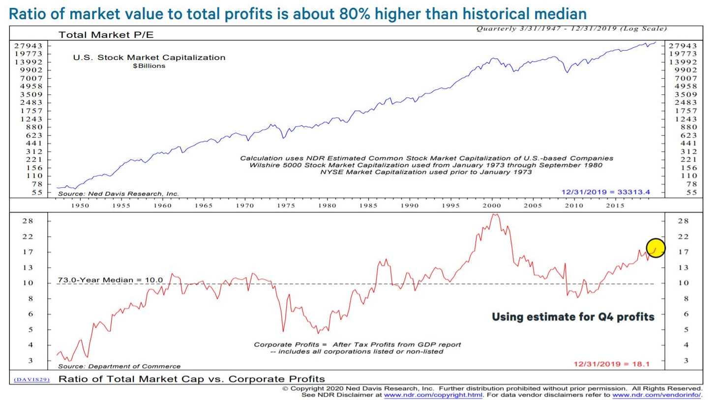 "但标准普尔500指数可能高估了获利,因企业回购减少了流通股,即便整体获利并未上升,但每股收益仍在增加。"戴维斯写道。因此,观察市场估值与总利润的比率,就会发现“市盈率比长期正常水平高出约80%,”