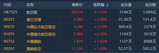 截至发稿,美兰空港(00357)涨3.29%,报6.28港元;东方航空(00670)涨2.88%,报4.28港元;南方航空(01055)涨2.1%,报5.36港元;中国国航(00753)涨1.92%,报7.97港元;国泰航空(00293)涨1.45%,报11.18港元。