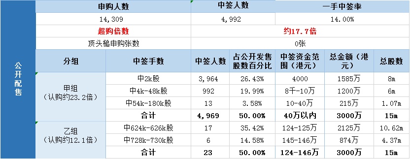 其中,公开配售申购人数14309,一手中签率14%,超购倍数约17.7倍。