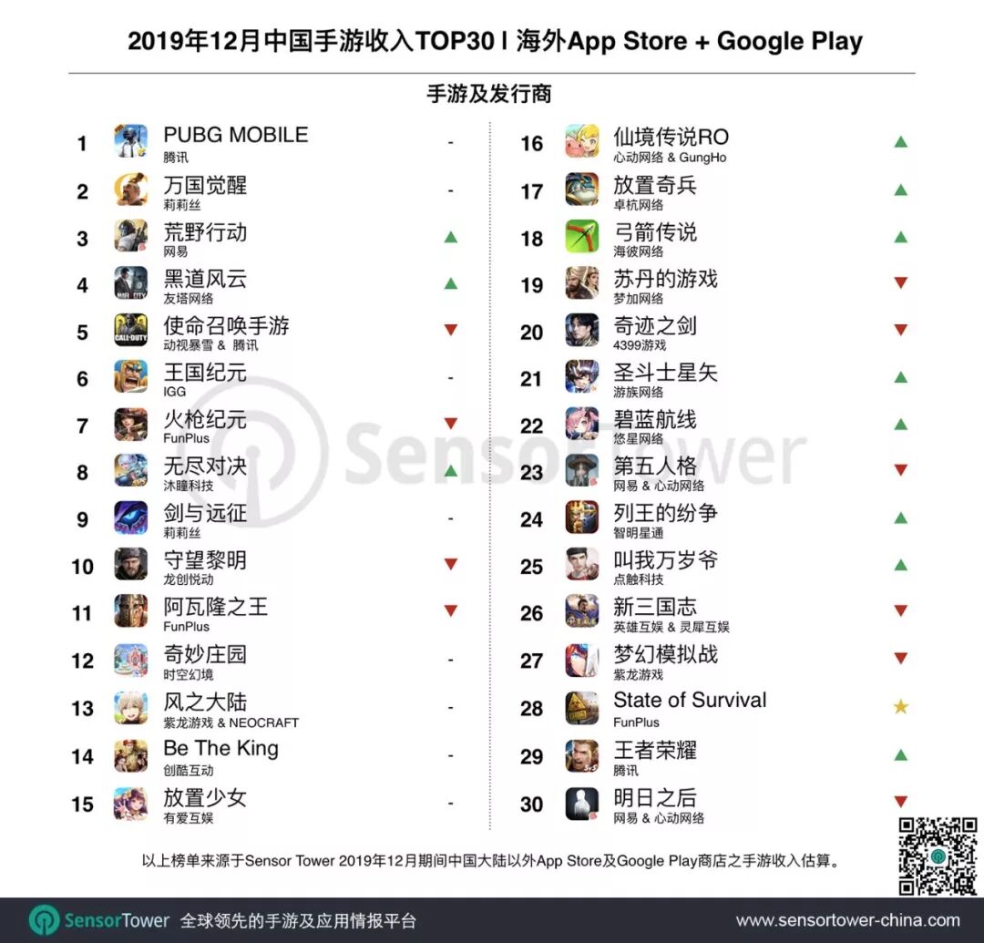Sensor Tower商店情报平台最新数据显示,2019年12月期间中国手游产品在海外市场收入排名TOP30,详细榜单变化如下。