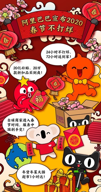 智通财经APP获悉,1月10日,阿里巴巴(09988)宣布2020年“春节不打烊”:今年春节期间,消费者在阿里巴巴平台上将可以享受新消费体验升级,吃喝玩乐、衣食住行将如日常一般便利。
