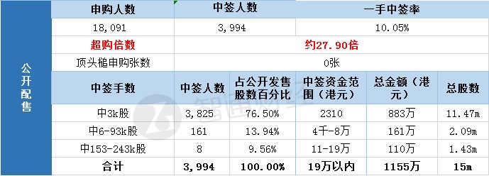 其中,公开配售申购人数18091,一手中签率10.05%,超购倍数约27.90倍。