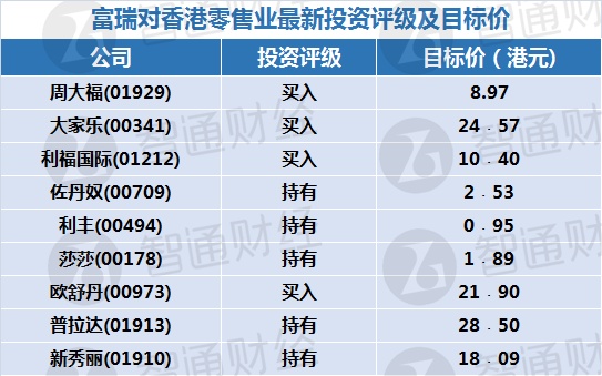智通财经APP获悉,富瑞发布报告称,首次覆盖香港零售行业,在行业中优先选择具有客户平衡及多元化组合的公司。当中,国际品牌看好欧舒丹(00973),首予“买入”评级。另外,本地品牌方面给予周大福(01929)、利福国际(01212)及大家乐(00341)“买入”评级。