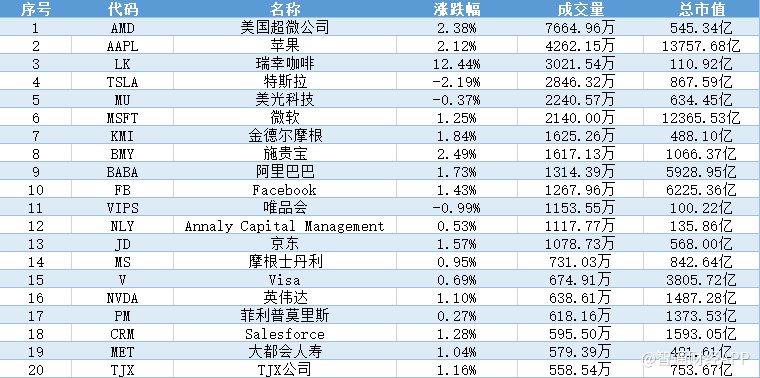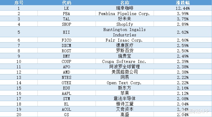 从涨幅来看,瑞信咖啡以12.44%涨幅位居第一。此外,中概教育股好未来(TAL.US)以3.75%的涨幅位居第三,新东方涨2.16%,位居第十五;芯片股美超微(AMD.US)涨2.38%,位居第十二,继续“吊打空头”;网易涨2.22%,紧随其后位列第十三;苹果、高盛分别涨2.12%、2.04%,位居第十六以及第二十。