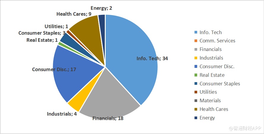 整体来看,在筛选后的89只个股中,属于信息技术板块的个股总计34只,占比达38%,列首位。其次,金融板块和非必须消费品板块分别以总数18只和17只位列第二及第三,占比分别为20%及19%,而其它板块个股数量较少,通讯服务板块和材料板块均无相关个股入选,如下图。