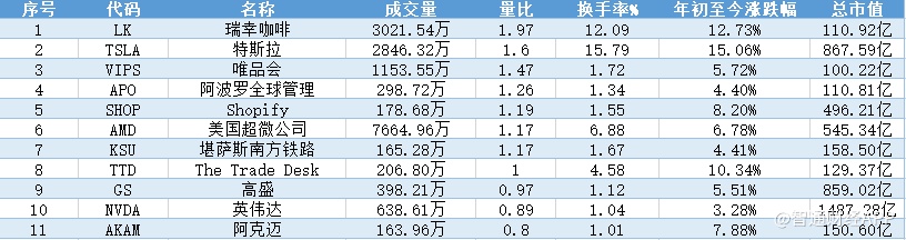 更近一步来看,在89只个股中,昨日换手率大于等于1%的个股有17家,排名前三分别为特斯拉(TSLA.US)、瑞幸咖啡、以及美超微,分别为15.79%、12.09%、与及6.88%;另外,量比大于等于0.8的个股有53家,在前五名中,索尼(SNE.US)以2.18位列第一,接下来是加拿大能源公司Pembina Pipeline(PBA.US)、瑞幸咖啡、Yandex(YNDX.US)、特斯拉,位列第二至第五位。