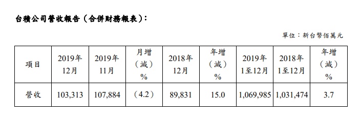 智通财经APP获悉,1月10日,台积电(TSM.US)公布了最新财报,数据显示,台积电10月营收1033.13亿新台币(合约34.5亿美元),同比增长15%但环比降低4.2%。全年营收达10699亿新台币(合约357亿美元),同比增长3.7%。