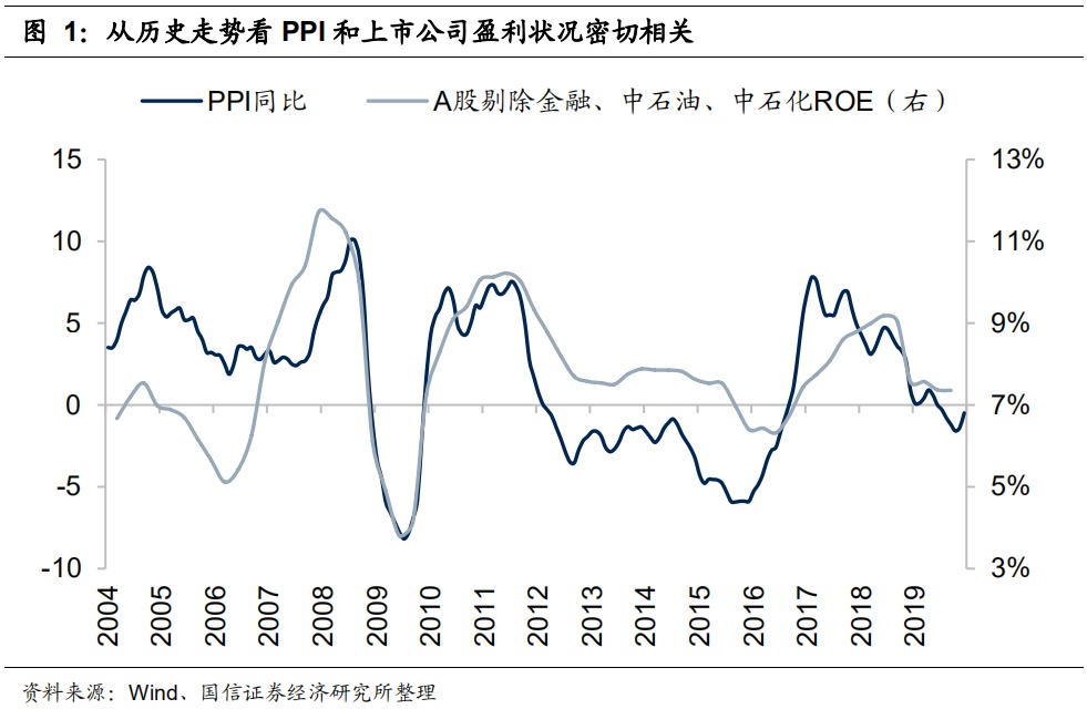 此轮 PPI 增速自 2017 年 3 月开始的回落周期一直持续到 2019 年,2019 年 7 月,PPI 同比增速出现了自 2016 年 9 月份以来的首次负增长。与此同时,上市公司的盈利状况也在持续下滑,全部 A 股剔除金融两油上市公司的 ROE 从 2018年 6 月的高点 9.2%降至 2019 年 9 月的 7.4%。但进入 2019 年四季度后,PPI 同比增速出现了向上的拐点,1 月 9 日公布的 12 月数据进一步确认了 PPI 止跌回升的趋势,我们认为,这是上市公司盈利状况改善的一个重要信号。