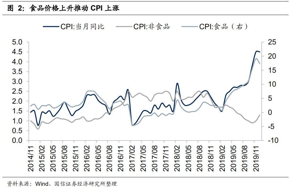 2019 年 12 月份 CPI 保持平稳,略低于市场预期。国家统计局公布的最新数据显示,2019 年 12 月全国居民消费价格同比上涨 4.5%,低于预期的 4.7%。其中,城市上涨 4.2%,农村上涨 5.3%;食品价格上涨 17.4%,非食品价格上涨 1.3%;消费品价格上涨 6.4%,服务价格上涨 1.2%。从环比来看,12 月 CPI 由上月上涨 0.4%转为持平。其中,城市持平,农村下降 0.1%;食品价格下降 0.4%,非食品价格上涨 0.1%;消费品和服务价格均持平。