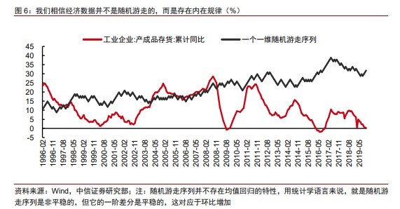 但是大多数认为经济周期存在的人,实际上都没有认为经济周期的波动是完美的。他们眼中的经济周期只是指“重复发生的涨落”,是指持续上涨一段时间后,必然出现下跌,是指持续下跌一段时间后,必然出现上涨。这种现象不仅发生在资产价格中,也发生在经济数据中。实际上在经济数据中,这种重复发生的平均持续时间非常稳定,比如对于 PPI 同比和工业企业产成品存货累计同比来说,大约就是 40 个月,所以我们称之为周期。