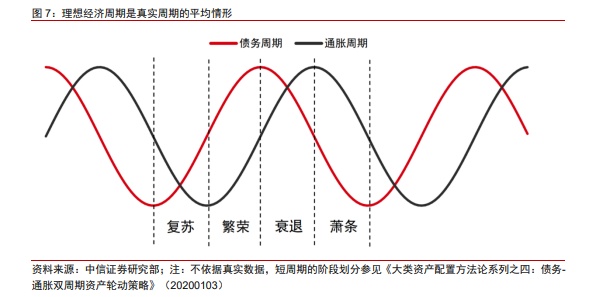 我们把经济周期划分为理想经济周期和真实经济周期两类。理想经济周期是指只有第一类因素驱动,假设经济的历史只是一个完全相同的循环结构。真实经济周期是包含了第二类因素以后的实际情形。理想经济周期是真实周期的平均情形,这实际上隐含非周期因素在周期各阶段随机发生。真实周期是非周期因素使得理想周期发生了偏移。