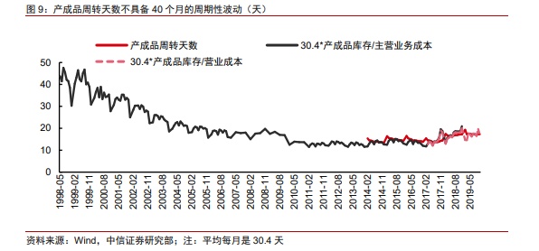 工业企业的产成品周转天数并不具备 40 个月左右的周期性波动。自 1998 年以来,产成品周转天数从高点 1.5 个月逐步降至 2011 年的低点 0.5 个月,此后缓慢爬升至当前的 17.3 天附近。这个拐点的位置可能有产能过剩的影响。但是除了明显的季节性波动以外,我们没有观察到周转天数有符合库存周期的长约 40 个月的周期性波动。这表明工业企业仅仅是把库存保持在一个“合意的”水平,来应对外部订单的波动。