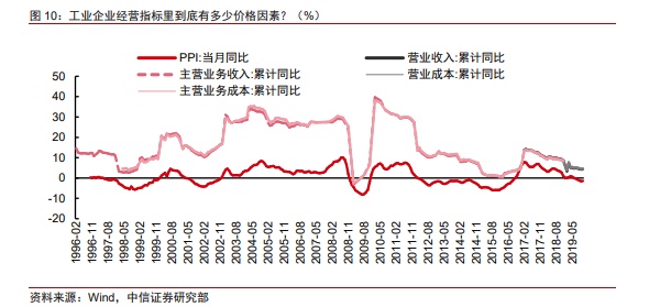 但是这种方法没有办法区分,产成品库存同比有多少是价格因素、多少是实际值。因为主营业务成本和营业成本也是名义值。实际上我们认为,准确区分库存指标里有多少真实库存是难以做到的,即便使用产成品库存同比减去 PPI 同比,因为权重的不同也存在很大误差。但我们可以从另一个侧面观察价格因素占比到底有多大。