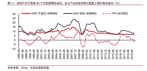由于工业企业经营指标不公布实际值,所以没有办法准确区分有多少价格因素。但是我们可以使用接近于工业产出且同时公布实际值、名义值的指标来做对比。最好的指标就是 GDP。代表经济真实产出的实际 GDP 并不具备 40 个月左右的周期性波动,而名义 GDP 的周期性波动实际上就是价格的波动。