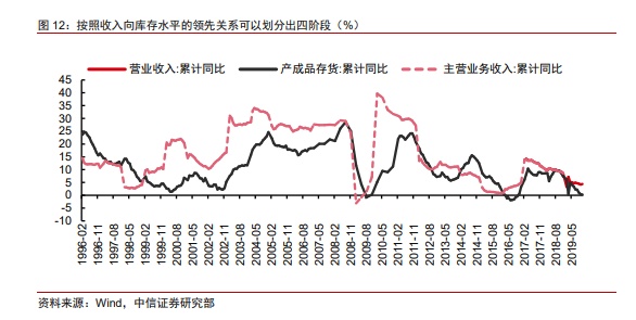 从实际数据上,可以根据收入增速对库存增速的领先性,划分出库存周期的四阶段。收入增速企稳回升,但库存增速仍下降,为被动去库阶段。两者同时上升为主动补库阶段。以此类推。