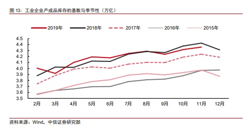 其次,在同比数据的分析中,基数效应非常重要。工业企业产成品库存数据存在明显的季节性,倾向于在每年 12 月下降,最低点一般是在 2 月,此后全年抬升。2018 年 12 月库存数据环比下降非常明显(-2.54%),过去 10 年中仅有 2015 年 12 月环比降幅超过这一水平(-2.60%)。只要 2019 年 12 月库存环比降幅小于 2018 年 12 月的水平,同比数据就会出现回升。因此我们预计,最乐观的情况下,本轮库存周期的最低点已经出现,就在 2019 年 11 月。