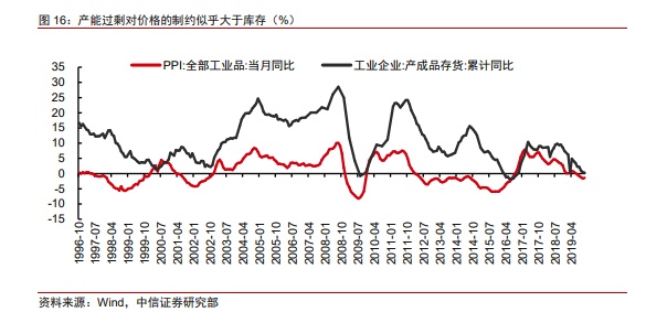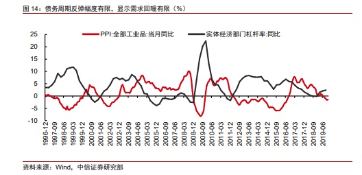本轮债务周期的回升幅度仅有上一轮周期的 1/3,显示经济总需求回升有限。债务周期反映经济总需求,其对于 PPI 的领先反映从需求回暖至价格抬升的时滞。本轮债务周期的回升幅度大约只有上一轮周期的 1/3,显示需求回升有限。2019 年底中央经济工作会议明确指出要稳定宏观杠杆率,我们预计 2020 年债务周期进一步复苏推升总需求的概率小。此外,去产能接近尾声,各行业又显示出产能过剩抬头的迹象。供强需弱格局下,PPI 反弹幅度可能会很有限,据中信证券研究部宏观组判断 2020 年高点低于 1%。