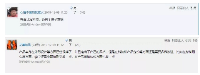 在研究中,我们发现一位虎扑JR发起了一个投票,标题为 “你觉得李宁的产品设计可以和阿迪耐克相提并论了么?”,将李宁的产品力直接对标耐克、阿迪达斯,引来近1500名群众的投票。