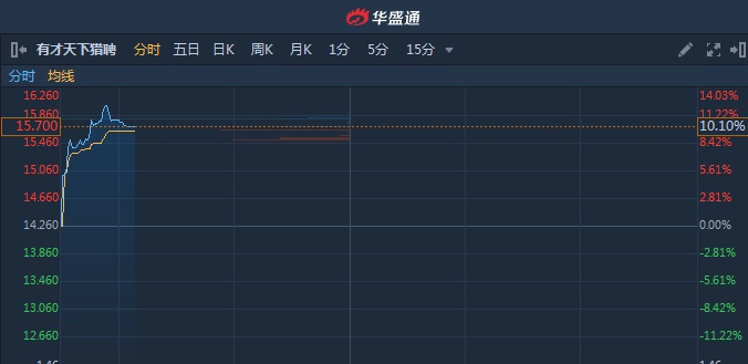 智通财经APP获悉,有才天下猎聘(06100)发盈喜,2019年经调整经营利润同比预增91.4%至111.4%。受利好消息刺激,早盘股价大幅攀升,截至10时02分,涨10.25%,报价15.72港元,成交额281.9万。