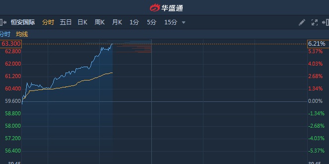 智通财经APP获悉,恒安国际(01044)获大摩看高至65港元,评级“增持”。该股近日股价连续走高,一度高见63.3港元,创半年新高,暂领涨蓝筹。截至11时14分,涨6.04%,报价63.2港元,成交额2.533亿。