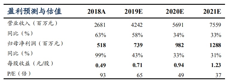看好公司产能扩张背景下持续的销售渠道下沉,基于公司业务扩张前景、以及不断迭代的激励机制,上调19-21年盈利预测,预计公司营收42.4亿(+58%)、56.9亿(+34%)、75.6 亿(+33%),归母净利 7.4 亿(+43%)、9.8 亿(+33%)、12.9 亿(+31%)亿元,对应 PE 为 65、49、37 倍,长期看好具有创新活力的研发和销售制度带来的增长动力,2020 年目标估值 60 倍,上调为“买入”评级。