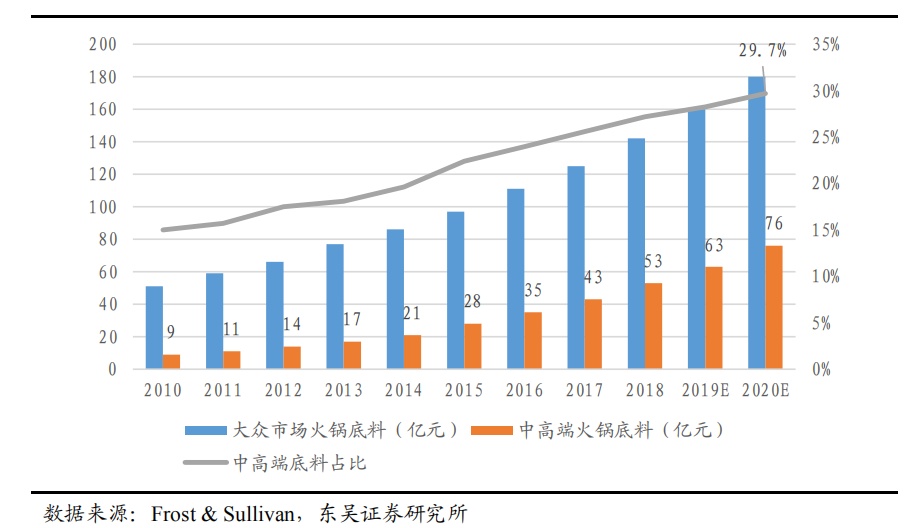 火锅调料产品:中高端市场增速领先,持续利好龙头公司。受益于消费升级,中高端火锅市场增长也推动中高端底料市场快速增长。Frost&Sullivan预计中高端底料市场规模将在2020年达到76亿,占比约30%。颐海国际定位中高端且伴随海底捞门店扩张不断放量,2015年公司中高端底料市占率已达35%,与竞对拉开差距,公司将持续受益于市场快速发展,进一步扩大自身份额。