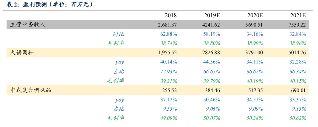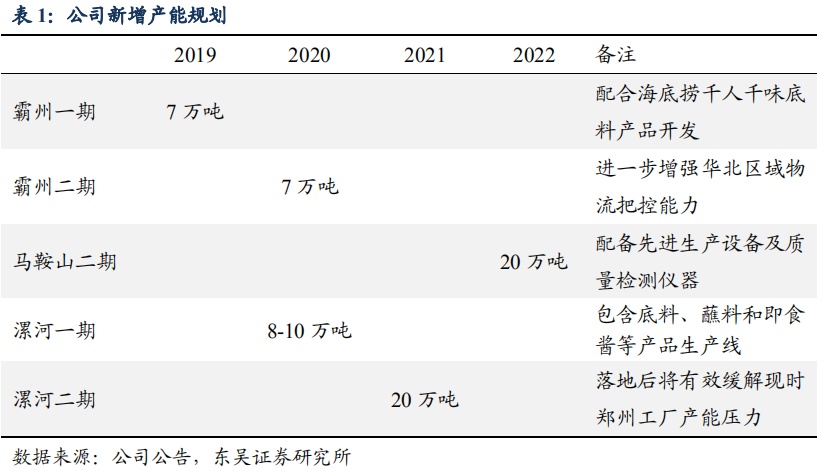 公司产能扩张计划实施顺利,霸州工厂一期项目落地新增产能 7 万吨;预计霸州二期、马鞍山二期分别将于 20/22 年竣工试产,马鞍山二期将配备先进生产设备及质量检测仪器,计划产能 20 万吨;预计漯河基地一期将于 2020 年底建成试产,预计一期产能将达到 8-10 万吨;二期计划于 2021 年建成并试生产,设计产能 20 万吨。公司的火锅调料业务未来潜力大、且休闲食品的品类和产品有望持续发展。三大生产基地合计可贡献产能将在未来 3 年达到 60 万吨以上,为底料、中式复合调味料及自加热系列产品放量提供有力支撑,奠基公司长期发展。
