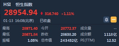 智通财经APP获悉,恒指早盘高开134.17点或0.47%,报28772.37点。截至收盘,恒生指数涨316.74点或1.11%,报28954.94点,全日成交额达1118.11亿。国企指数涨1.15%,报11396.76点,红筹指数涨0.73%,报4560.72点。