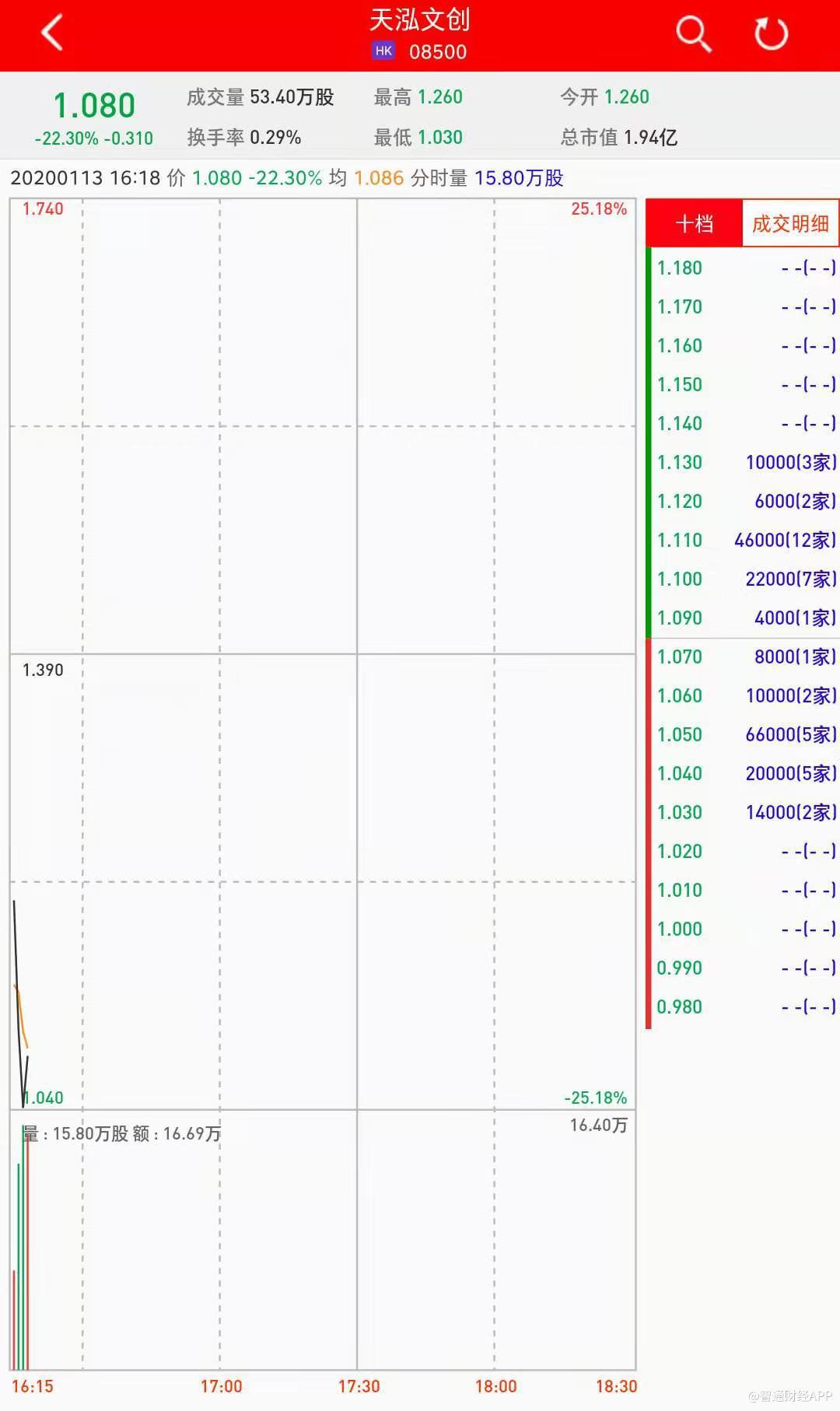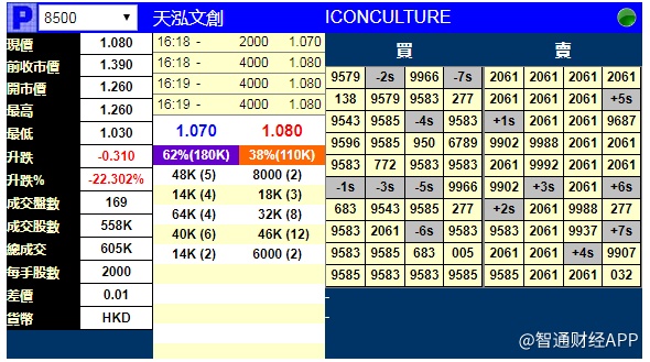 智通财经APP获悉,天泓文创(08500)将于1月14日挂牌,今日暗盘大幅低开,截止到发稿,辉立证券暗盘交易显示其报价1.08港元,较招股价1.39港元跌22.302%。每手2000股,不计手续费,每手亏620港元。