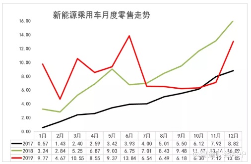 2019年新能源乘用车市场走势呈现出前高后低的差异化走势,1—6月份新能源乘用车市场走势相对较强。7月以来新能源汽车市场走势相对疲软。12月的新能源汽车市场销量13.7万台,相对于出现年末拉升的走势,相对于6月份的销量偏高。