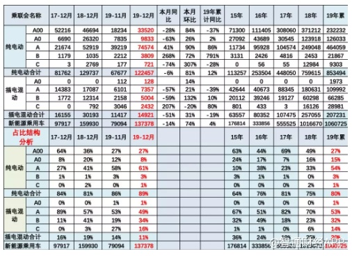 2019年12月纯电动中的A00级电动车有3.4万台,同比下滑28%,占纯电动乘用车27%份额,较18年12月的36%下降巨大。