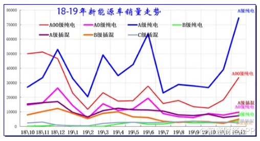 2019年主要是A级电动车的销量波动巨大, A级车的大市场主要靠纯电动拉动,A级插混表现较差。