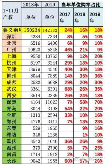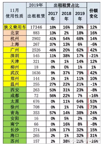 北京由于6万指标限制,没有持续放号,指标缺乏,因此19年4季度北京销量增表现一般,11月的部分私车年度指标开始年末购车。广州、武汉、杭州、西安、重庆等的出租租赁比例较强。