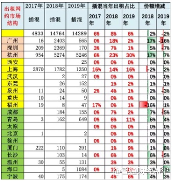 2019年的出租网约市场的插混车型占比急剧下降,从18年的8%下降到19年的6%。并导致插混市场的竞争格局明显变化。