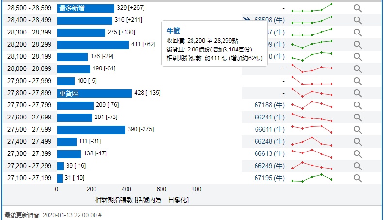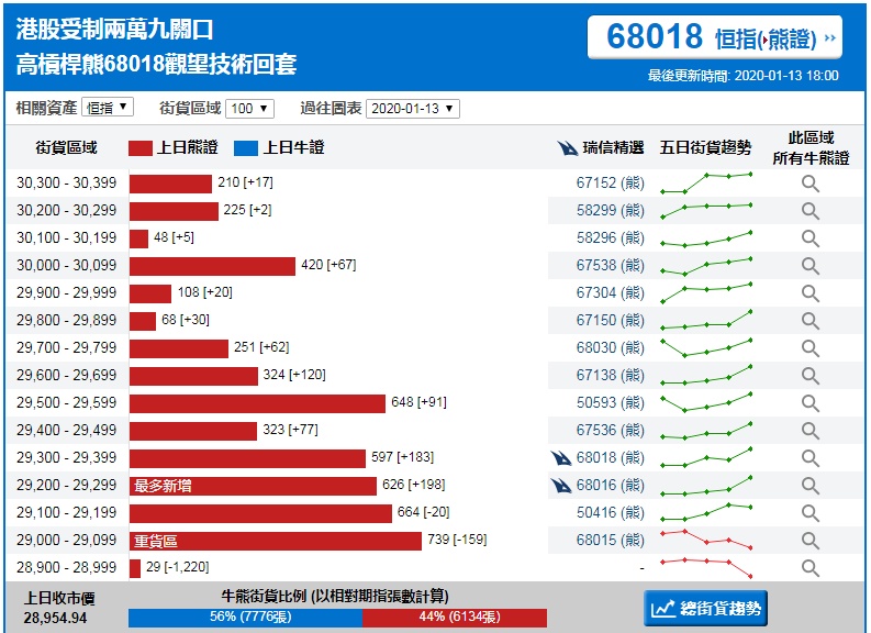 智通财经APP获悉,截至1月13日,恒指最新的牛熊街货比例56:44。瑞信恒指牛熊证街货分布图中的数据显示,熊证街货重货区在29000-29099区间,该区间最新熊证数量为739张,较上一交易日减少159张,最多新增在29200-29299区间,该区间最新熊证数量为626张,较上一交易日增加198张。牛证街货重货区在27800-27899区间,该区间最新牛证数量为428张,较上一交易日减少135张,最多新增在28500-28599区间,该区间最新牛证数量为329张,较上一交易日增加267张。