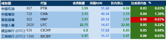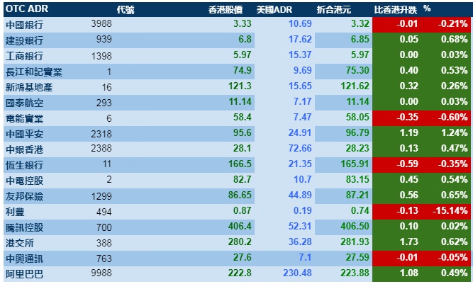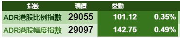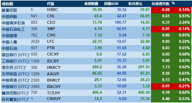 智通财经APP获悉,周一美股标指和纳指再创新高,刺激港股ADR指数全日造好,按比例计算,收报29055点,升101.12点或0.35%。大型蓝筹上涨为主,汇丰控股收报59.87元,较港收市跌0.08元;腾讯控股收报406.5元,较港收市升0.1元。