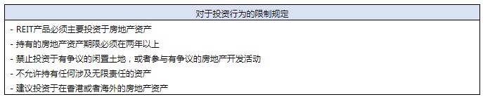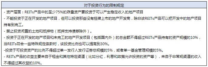 a、资产层面:REITs产品中的至少75%的存量资产要投资于可以产生稳定收入的地产项目。b、不能投资于正在开发的地产项目,但可以投资那些没有挂牌上市的地产开发商,除非该REITs产品可以把开发中的地产项目持有到完工。c、禁止投资闲置的土地和抵押物(抵押支持债券除外)。d、投资于正在开发的地产项目和未完工的地产开发项目(包括国内外)的总金额不得超过REITs产品持有的资产规模的10%,当REITs符合一些特殊规定条款时,该投资比例也可以提高到30%。e、投资于可投资资产的比例不得超过单一发行人发行证券总规模的5%,或者单一基金管理规模的5%。f、REITs产品的收益主要来自于租金和其他特定渠道(比如分红,利息和政策允许投资的资产等),来自于非常规渠道的收入不得超过其收益的10%。