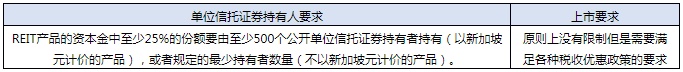 对于以新加坡元计价且在新加坡交易所挂牌上市的REITs产品,其资本金的至少25%的份额要由至少500个公开投资者持有。