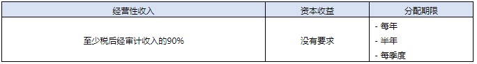 严格意义上来说,还没有一个法规或者法律要求REIT产品在每个财务年度內按照一定的比例把其收益分配给持有人。但是为了享受税收转移优惠政策,REIT产品的受托人一般都会每年按照其应纳税特别收入的至少90%的比例分配收益。