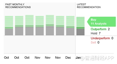 在接受调查的20位投资分析师中,11为分析师给予该公司“买入”评级,2位分析师给予“跑赢大市”评级,7位分析师给予“持有”评级。